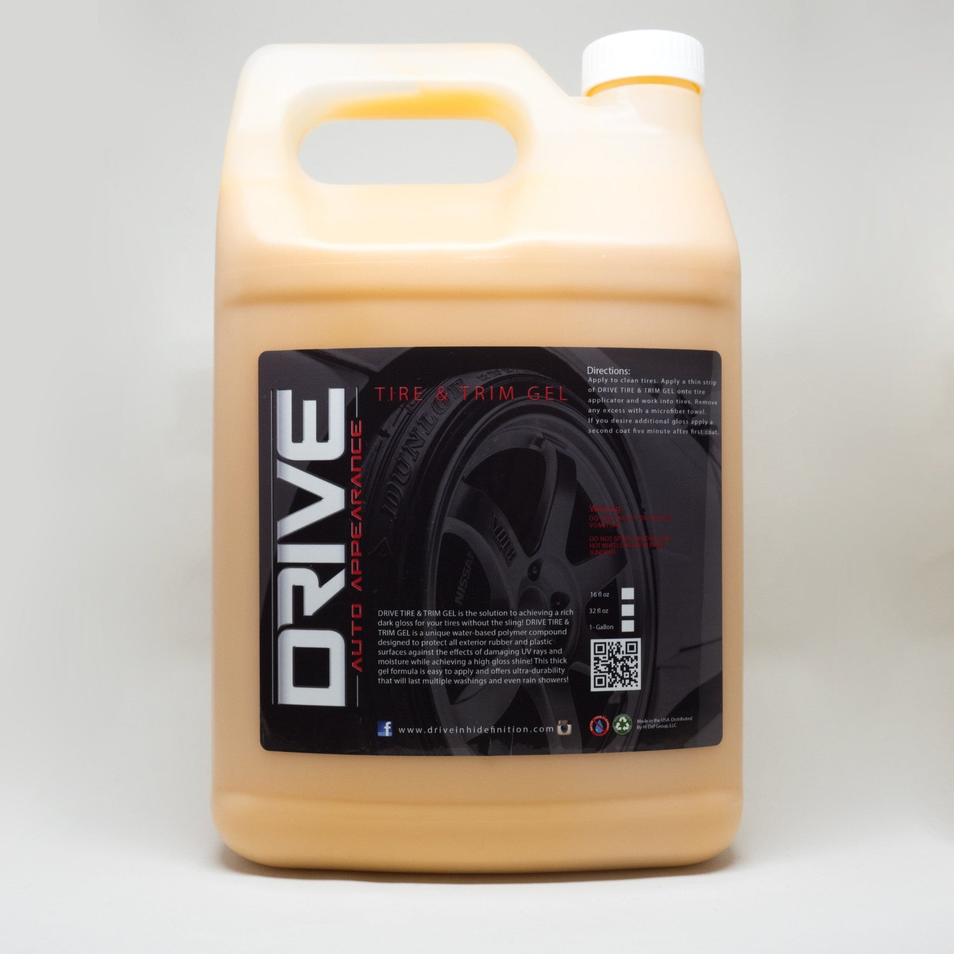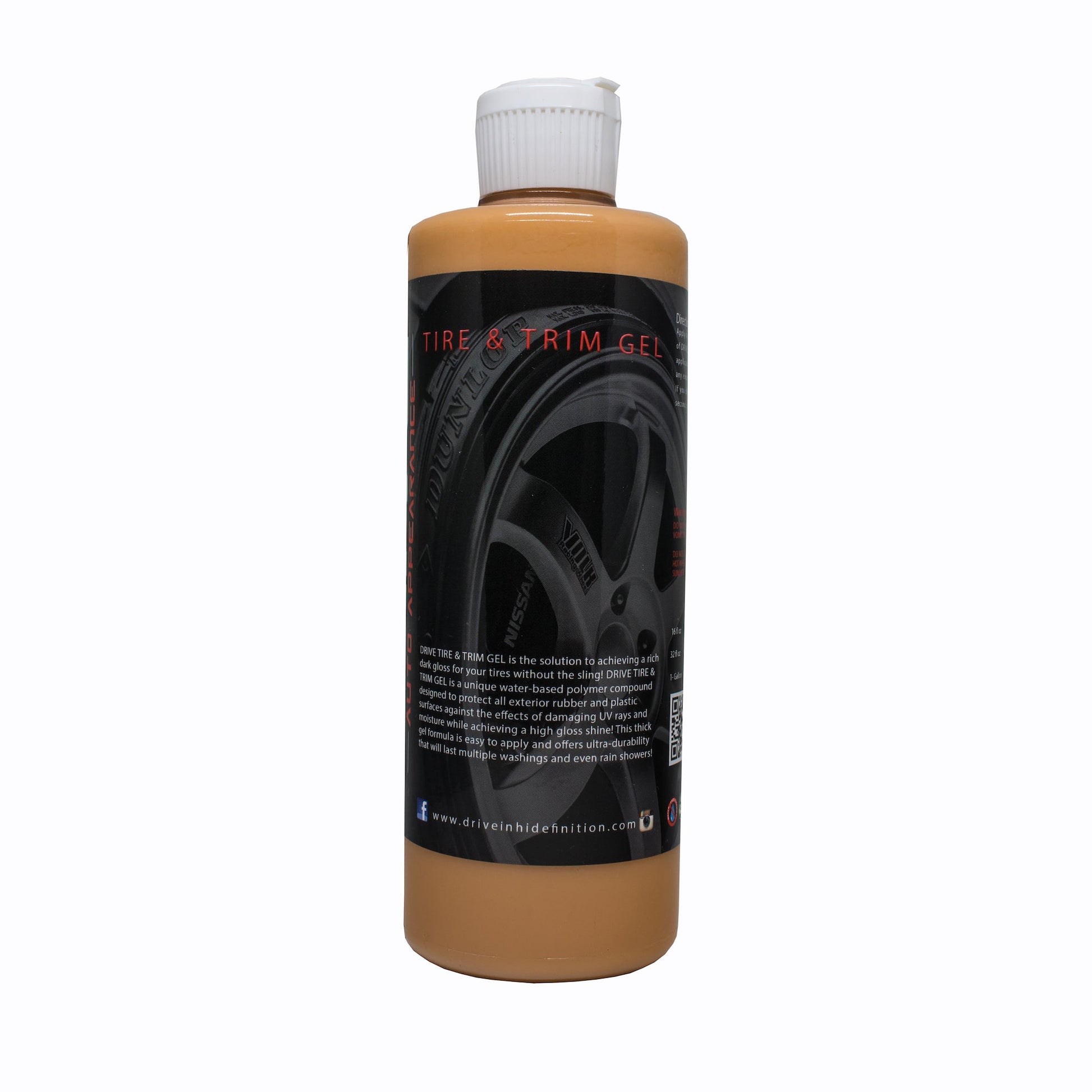 DRIVE TIRE & TRIM GEL is the solution to achieving a rich dark gloss for your tires without the sling! TIRE & TRIM GEL is a unique water-based polymer compound designed to protect all exterior rubber and plastic surfaces against the effects of damaging UV rays and moisture while achieving a high gloss shine! This thick gel formula is easy to apply and offers ultra-durability that will last multiple washings and even rain showers!